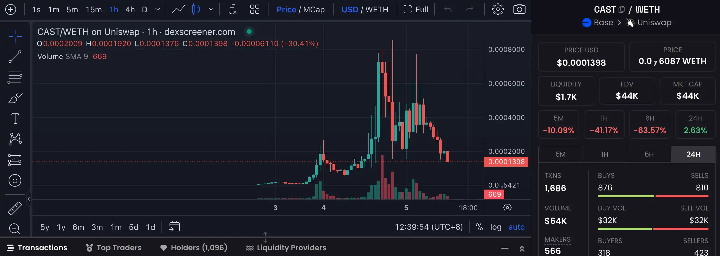 因此 cast 与发推的意思类似,也构成了 Farcast 最核心的功能之一。同样的,MEME 无孔不入,与该功能重名的$CAST 代币开始出现,截止发文时市值仅为 4 万美金。
