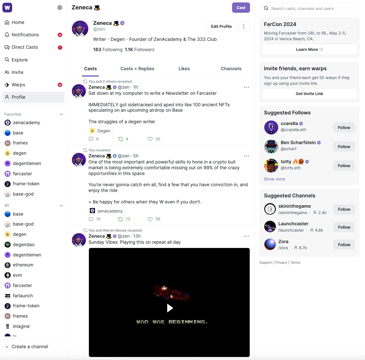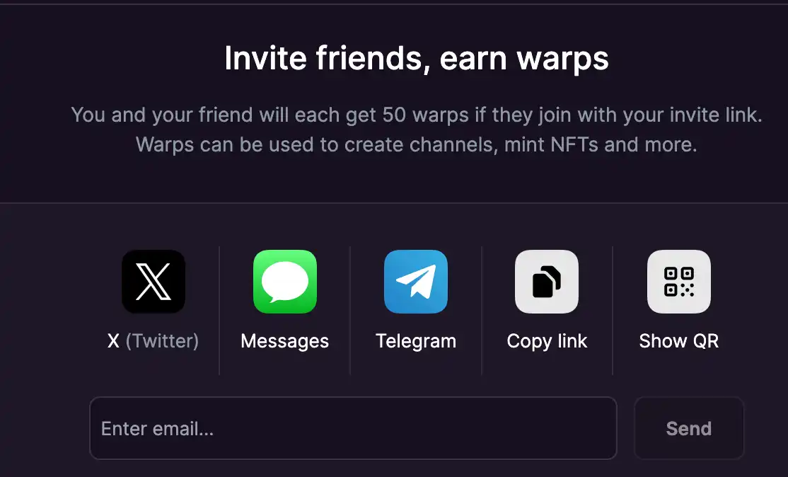 对 Farcaster 有兴趣的读者,也可以通过笔者的邀请链接进行注册,成功注册后也可以得到 50 个 warps,用于在应用中创建频道、Mint NFT 或进行更多操作。