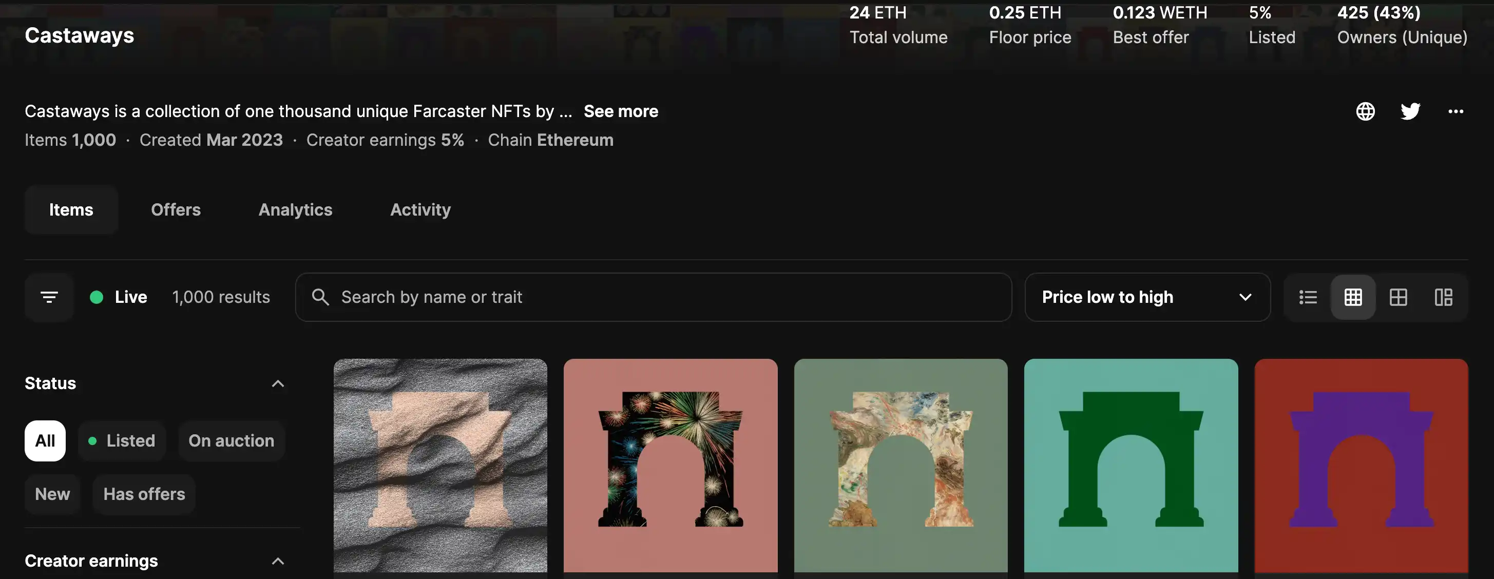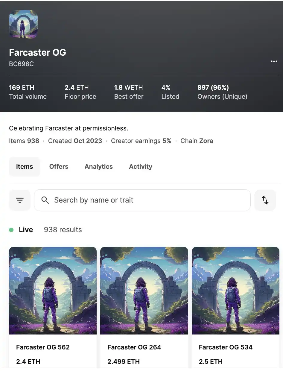 值得一提的是,该项目是一个老系列,去年 3 月就开始了 Mint,但是一直没有太多的热度,直到今年 2 月左右,Farcaster 翻红,所有的 NFT 才被 Mint 完毕。