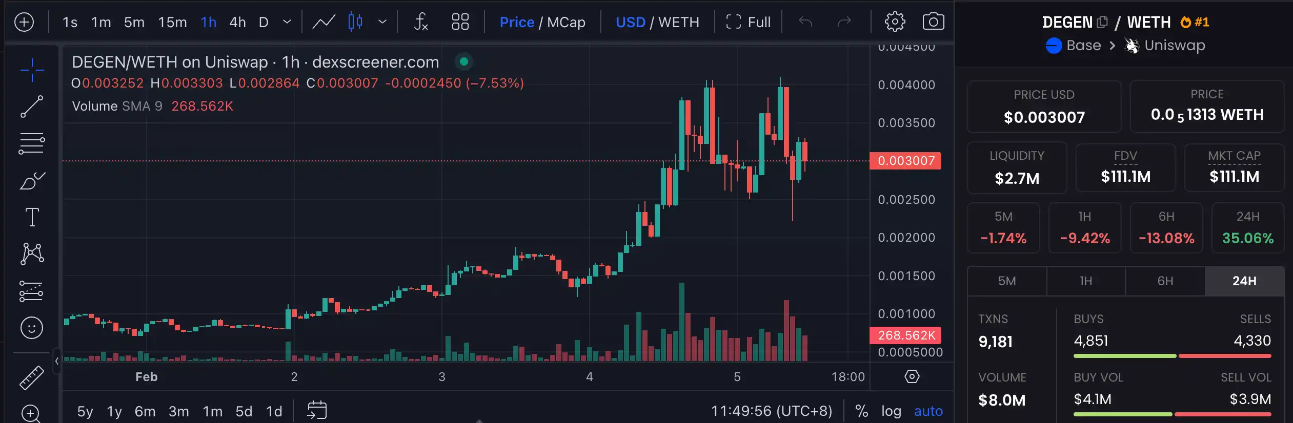 而在 1 月 26 日左右,Degen 的价格不过 0.0002 美金,目前看已经上涨了接近 15 倍。