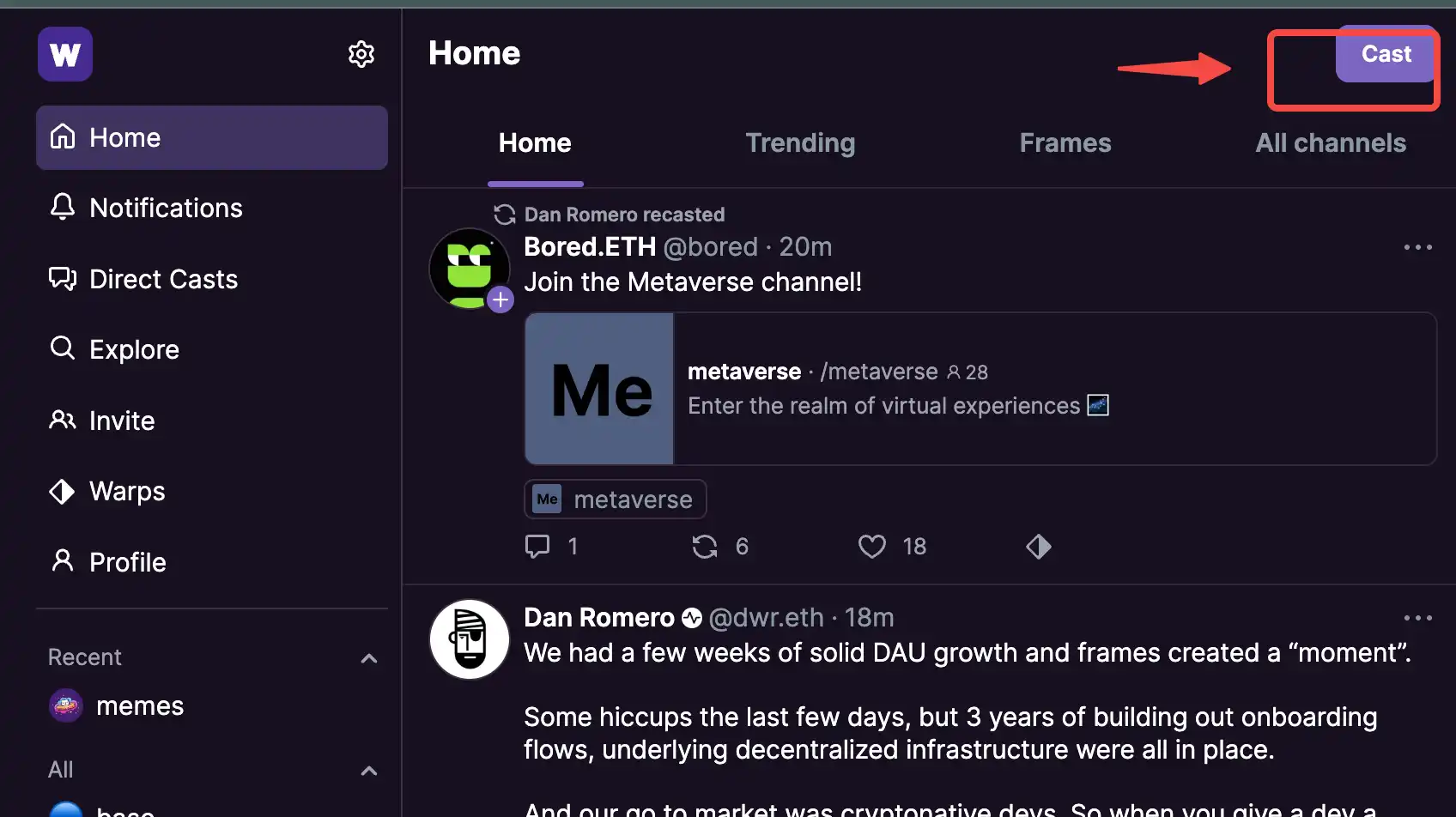 在 Farcast 的应用 app warpcast 中,你的每一个发帖都有一个名为「cast」的按钮,点击即可发送自己的帖子。
