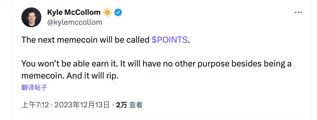 早在去年 12 月,推特用户 Kyle McCollom 发了条推文,预测会有一个名为 Points 的 MEME 币出现,而且注定会失败。