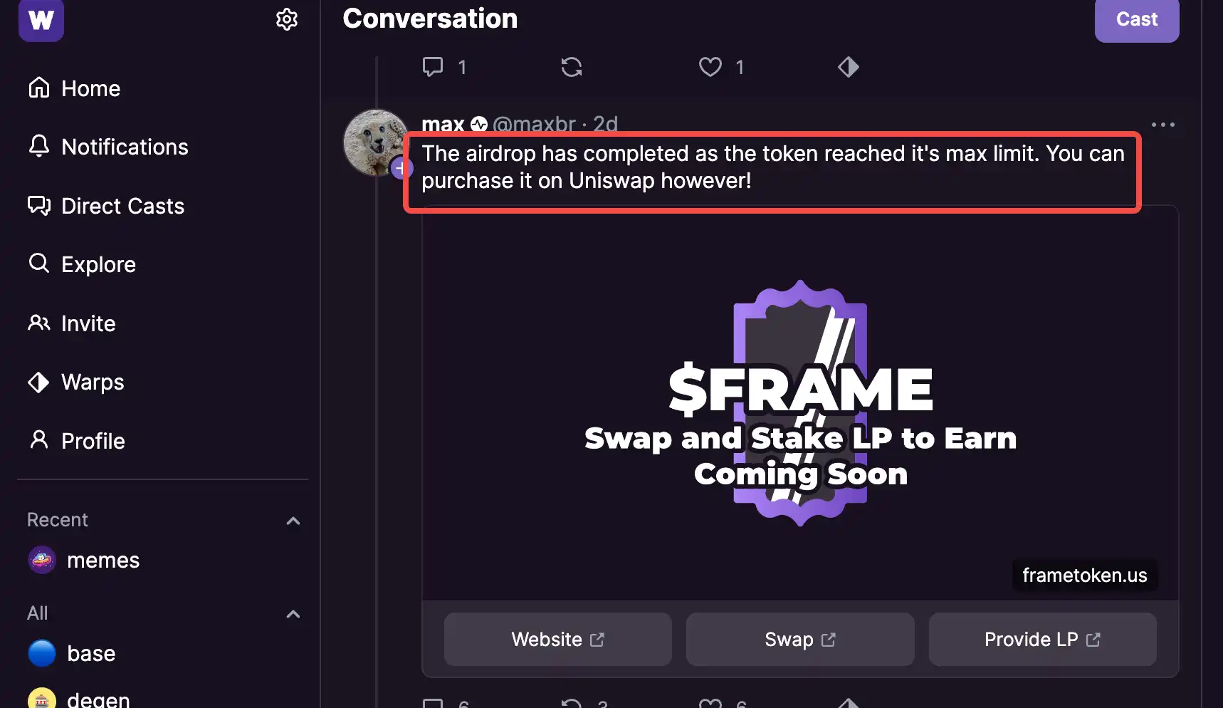 目前$FRAME 将用于向 Farcaster 生态系统中的 Builder,特别是那些使用 Frames 构建的 builder 提供赠款、赏金和奖励。但空投代币已经领完,目前仅可在 Uniswap 等二级市场上进行购买