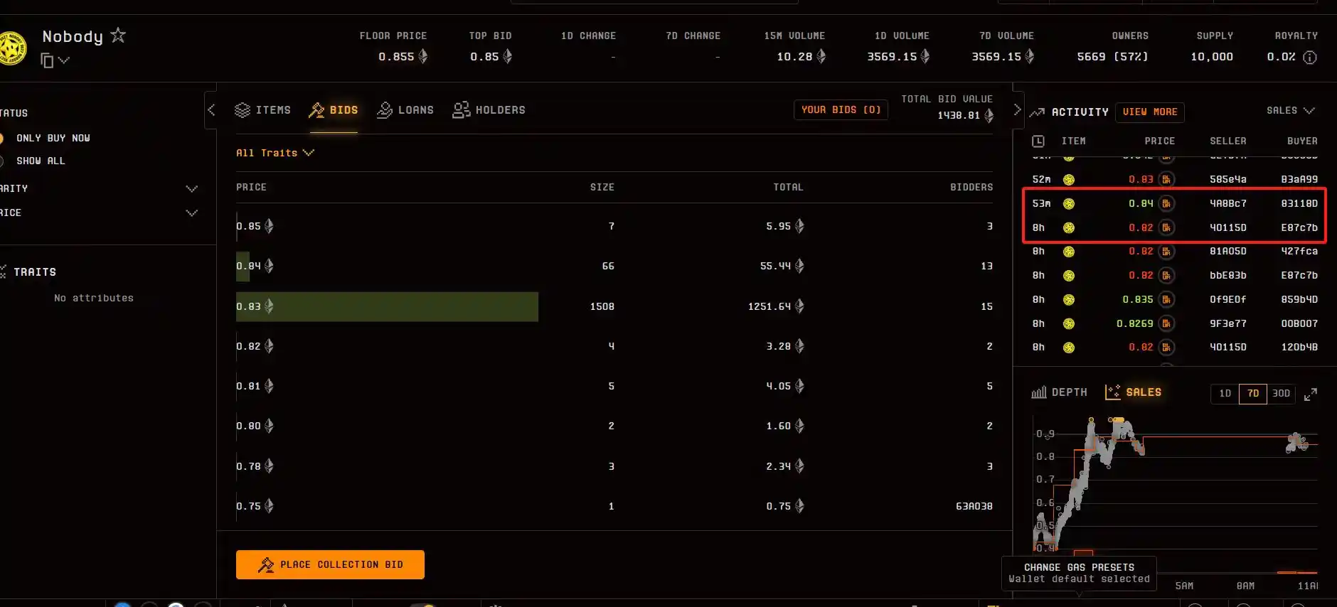 而除了 OKX 在预热运营方面的加持,在 NFT 铸造结束后,在 blur 上的 bid 价格也能窥见 Nobody 在 NFT 玩法上的「娴熟」。据 观察,在其地板价攀升至 0.05 ETH、0.08 ETH 左右时,存在大量在地板价的买单墙,这可以防止 Nobody 获利者止盈对整个 NFT 系列价格的负面影响。这样的「防守」策略也得以使 Nobody 自 0.2ETH 一路攀升,没有出现大幅砸盘情况。