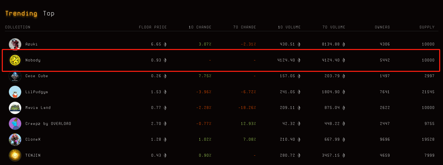 2 月 1 日,因周星驰参与而备受社区关注的 NFT 项目 Nobody NFT,以 0.19527 ETH 的初始发行价开启铸造后,48 小时间接收了超 3192 枚 ETH,打款总额超 172%。在铸造截止、NFT 发放完毕后,2 月 5 日 Nobody NFT 地板价已突破 0.9 ETH,涨幅为 4.8 倍,交易量已达 3287.16 ETH。