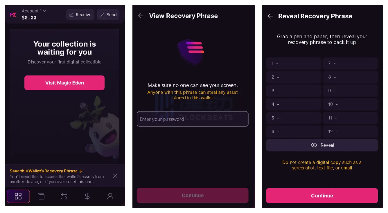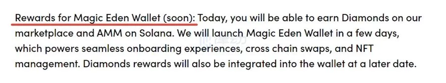 值得注意的是,只有曾经使用过 Magic Eden 上的 Phantom 或 Phantom List On ME 功能才有资格直接领取到钻石空投,而注册 Magic Eden 钱包,并用其在 Magic Eden 交互是为了获得官方承诺的其余奖励。比如,Magic Eden 将于 2 月在钱包内发布来自 Claynosaurz、Degenerate Ape Academy 和 BoDoggos 等 NFT 项目的免费 mint,还能增加 mint 白名单的几率等等。