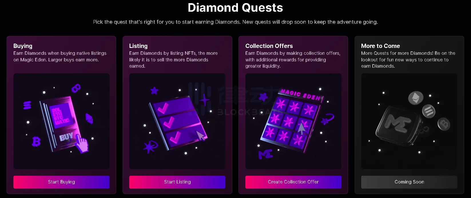 对于 Magic Eden 钱包的新用户,目前可以通过另外三种任务获取钻石奖励,分别是 Buying、Listing、Collection Offers。