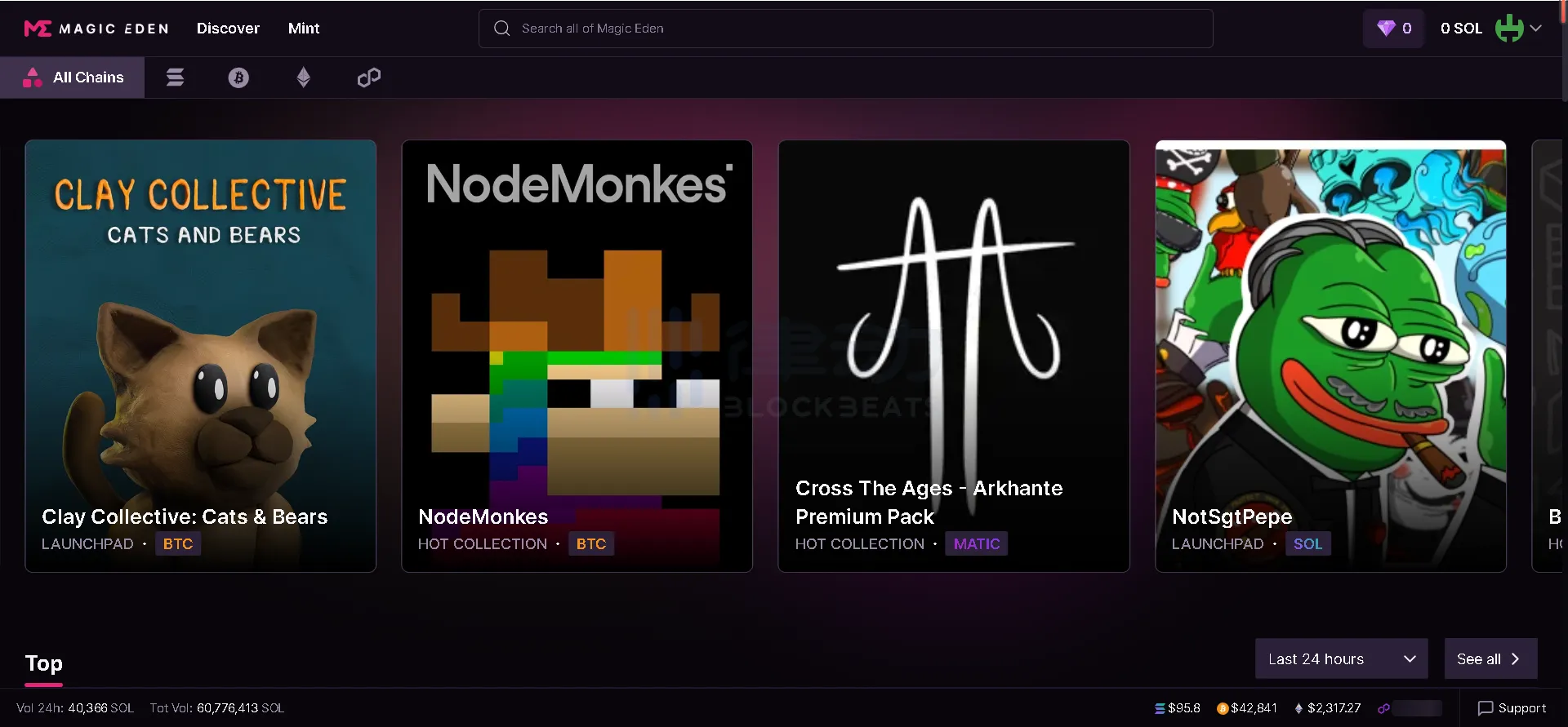 Magic Eden 是 Solana 上最大的 NFT 市场,据 Magic Eden 官网数据,截止目前其交易总额为 60,778,748 SOL,交易者数量超 80 万个。此后 Magic Eden 还部署了以太坊、Polygon 等多条公链,近期也推出比特币生态 NFT 市场。