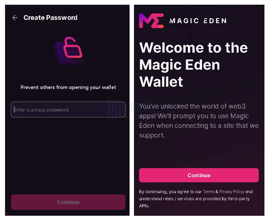 根据提示依次输入两次相同密码,点击「Continue」(继续)进入下一步。