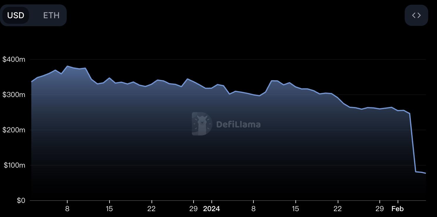 Lybra Finance 的总锁仓价值(TVL)近日出现了断崖式下跌。DeFiLlama 数据显示,截至 2 月 5 日,Lybra Finance 的 TVL 在过去一周从约 2.6 亿美元跌至 0.76 亿美元,跌幅达 69.7%。与此同时,Lybra Finance 代币 LBR 价格也出现闪崩。CoinGecko 数据显示,过去 7 天,LBR 价格下跌了约 51%。