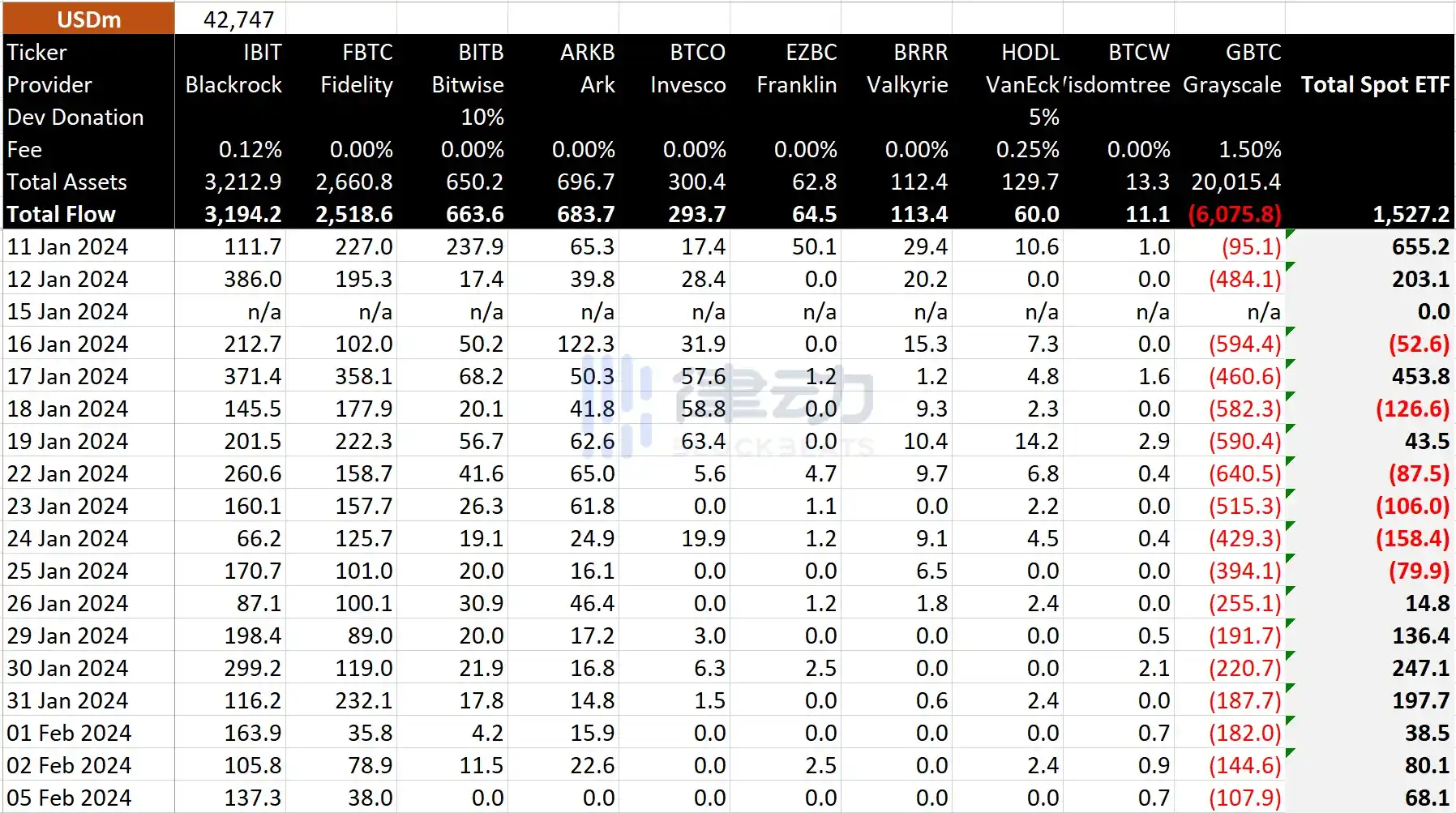据 BitMEX Research 数据监测,2 月 5 日比特币现货 ETF 净流入 6800 万美元。其中贝莱德旗下 IBIT 净流入 1.373 亿美元。灰度 GBTC 资金流出约 1.079 亿美元,富达的 FBTC 资金净流入为 3800 万美元,WisdomTree 的 BTCW 资金净流入为 70 美元。