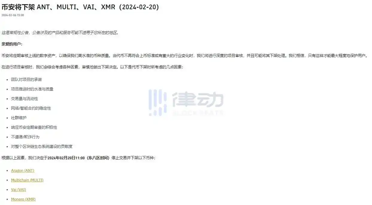 Binance 将于 2 月 20 日下架 ANT、MULTI、VAI、XMR