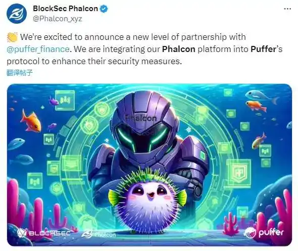 据官方消息,BlockSec 旗下安全开发和主动防御套件 Phalcon 宣布与 LSD 协议 Puffer Finance 达成合作。Phalcon 将集成到 Puffer 的协议中,为 Puffer 用户提供链上资产保护。