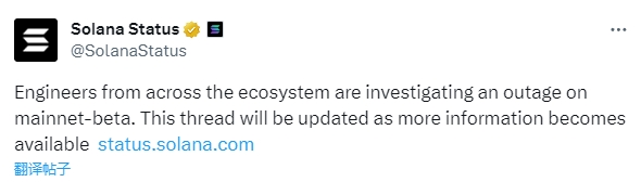 Solana:工程师正在调查网络中断问题,将及时更新进度信息