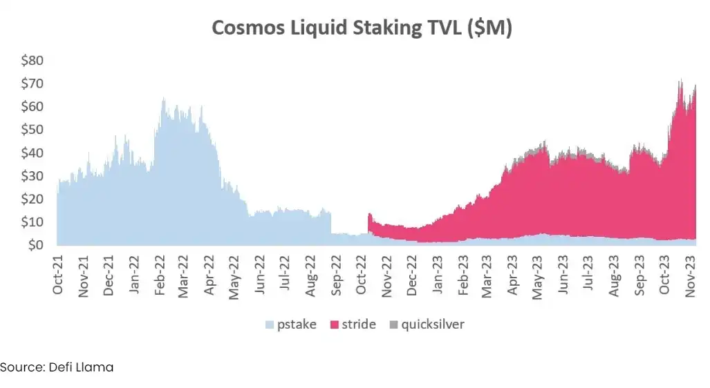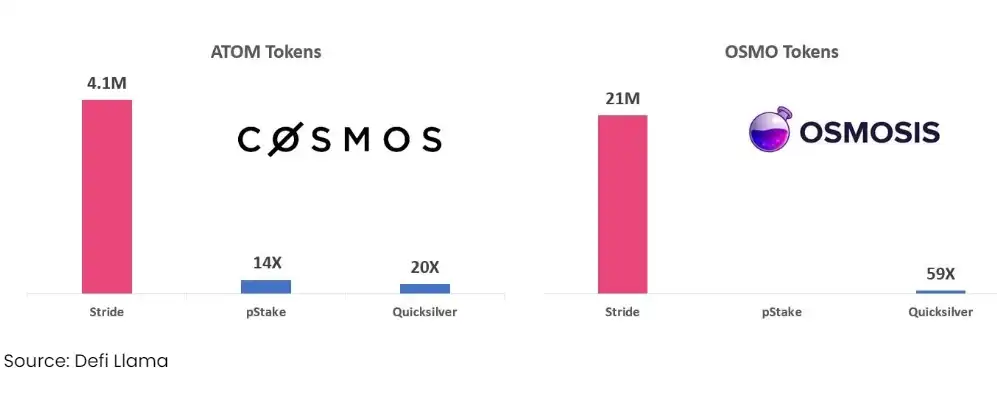 pStake 是第一个先行者,2022 年 2 月推出并通过空投和对 OSMO(称为 stkOSMO)的支持迅速吸引 6000 万美元的 TVL。然而在熊市和过去的 18 个月里,Stride 迅速崛起并超过了 pStake 在 TVL 上的地位。