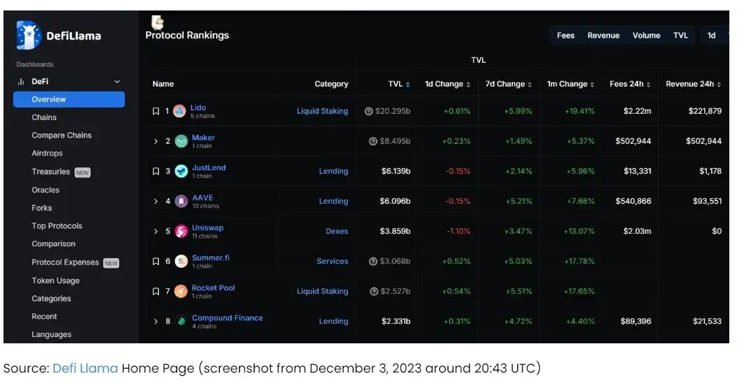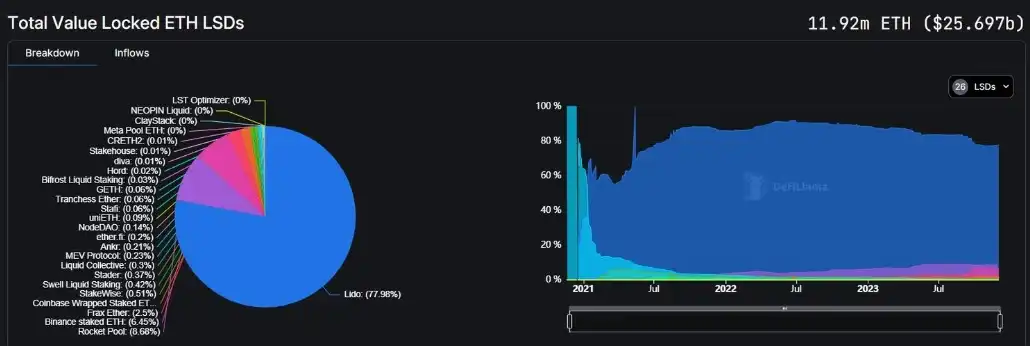 流动性质押是 DeFi 领域非常大的类别,最大的成功案例是 Lido。Lido 现在已经成为整个加密货币领域的第一大协议,其总锁定价值(TVL)超过 200 亿美元,占所有质押以太坊的近三分之一。Lido 每年赚取超 8000 万美元的费用。