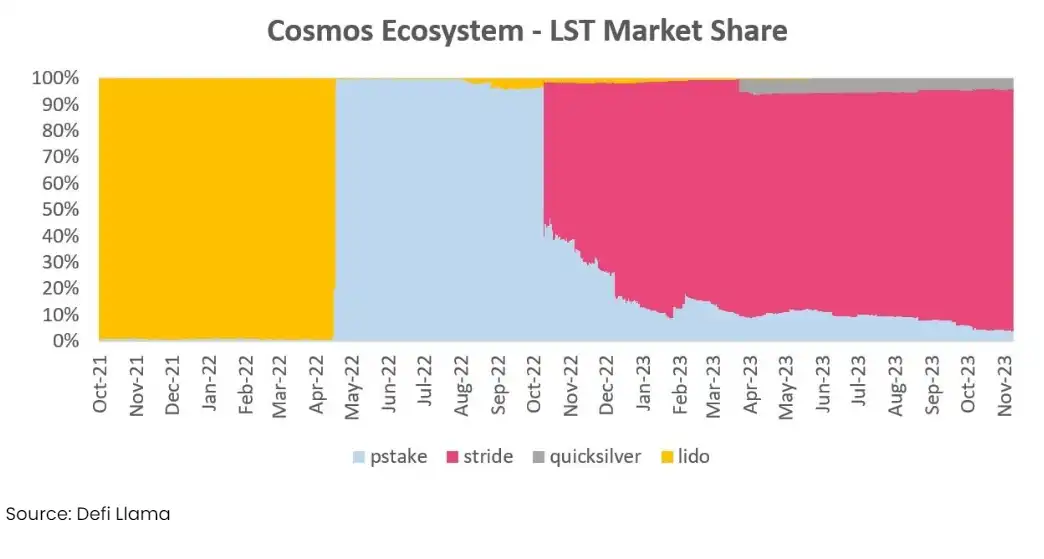 当前,Stride 在 Cosmos 生态系统的流动质押市场(LST 市场)中占主导地位,拥有超过 90% 的 LST TVL 份额。