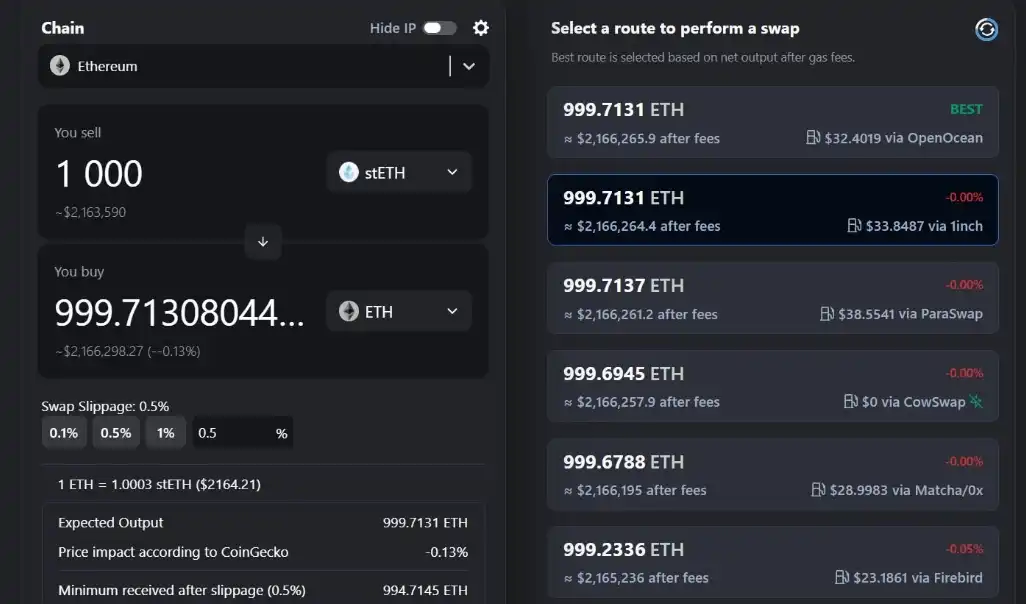 · 在公开市场出售:通常用户需要通过 Lido 解除质押 ETH,这取决于以太坊的退出队列,可能需要等待数天到数周的时间。如果用户不想等待,他们可以在公开市场上出售 stETH。出售 1000 个 stETH(200 多万美元)会产生大约 10-15bp 的滑点。