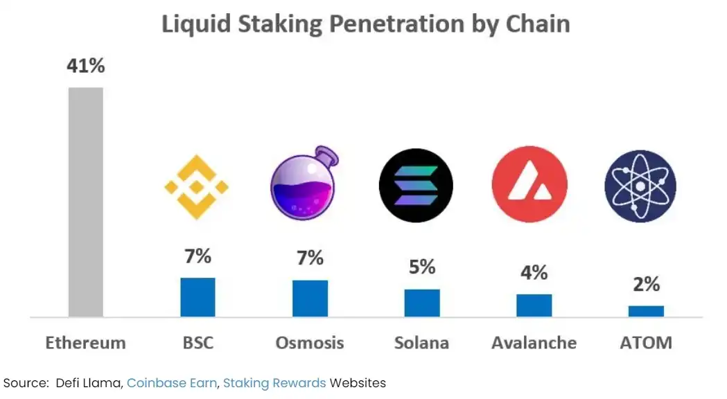 按生态系统划分,流动性质押的渗透率差异很大。以太坊是目前最成熟的生态系统,占 41%,而其他大多数生态系统都在 2-7% 的范围内。