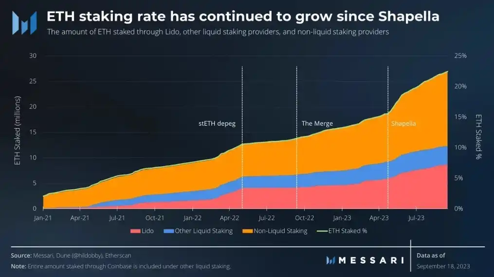 这些网络效应巩固了 Lido 的主导地位,其持有近三分之一的质押 ETH 总量,并在过去 2-3 年内稳步增加份额。随着质押 ETH 比例的稳步上升,Lido 继续受益。事实上,Lido 的主导地位如此之大,以至于许多人呼吁对其在以太坊上的系统性重要性进行检查,包括实行 Lido + stETH 双代币治理,以检查 Lido DAO 是否与以太坊 /stETH 持有者保持一致。