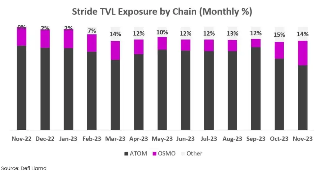 · 市场份额保持稳定:LSTs 通常表现出赢家通吃的效应,正如以太坊生态系统中的 Lido 所看到的那样。自 2023 年 1 月 1 日以来,Stride 的市场份额已从 72% 增长到 92%,并且我们预计其可以继续主导这个市场。