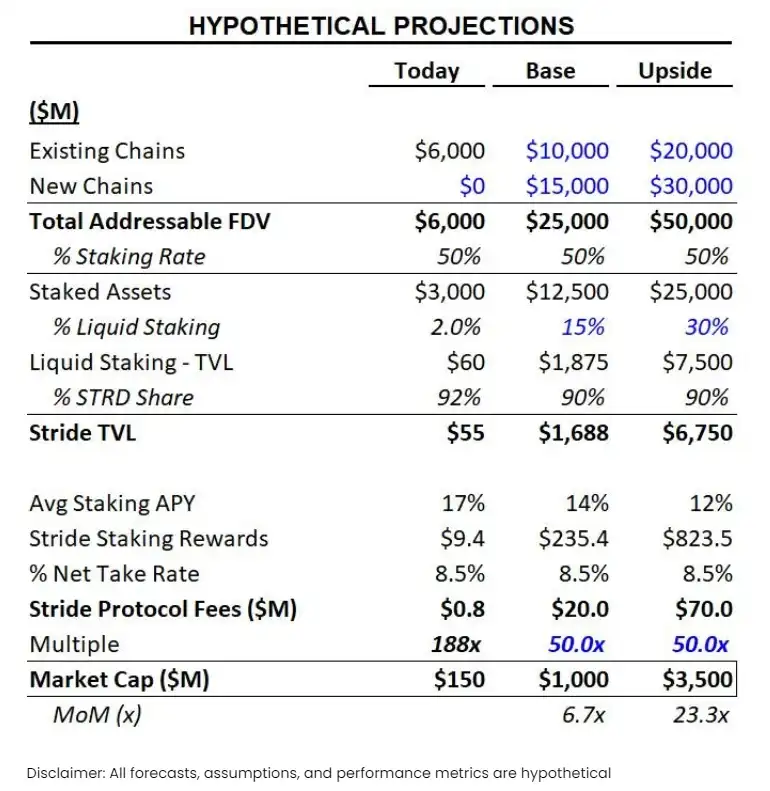 · Stride 的 FDV 增长:我们假设 Stride 的 FDV 从 60 亿美元增长到 250 亿美元。目前,Stride 从现有的链(主要包括 ATOM、OSMO 和 INJ)中获得 60 亿美元的 FDV。我们假设这在一个市场周期内增长到 100 亿美元。Stride 正在开发对 dYdX 和 Celestia(TIA)的支持,这两者目前代表近 100 亿美元的 FDV。由于我们对 dYdX 和 Celestia 持乐观态度,我们假设它们的 FDV 将增加 50% 至 150 亿美元。