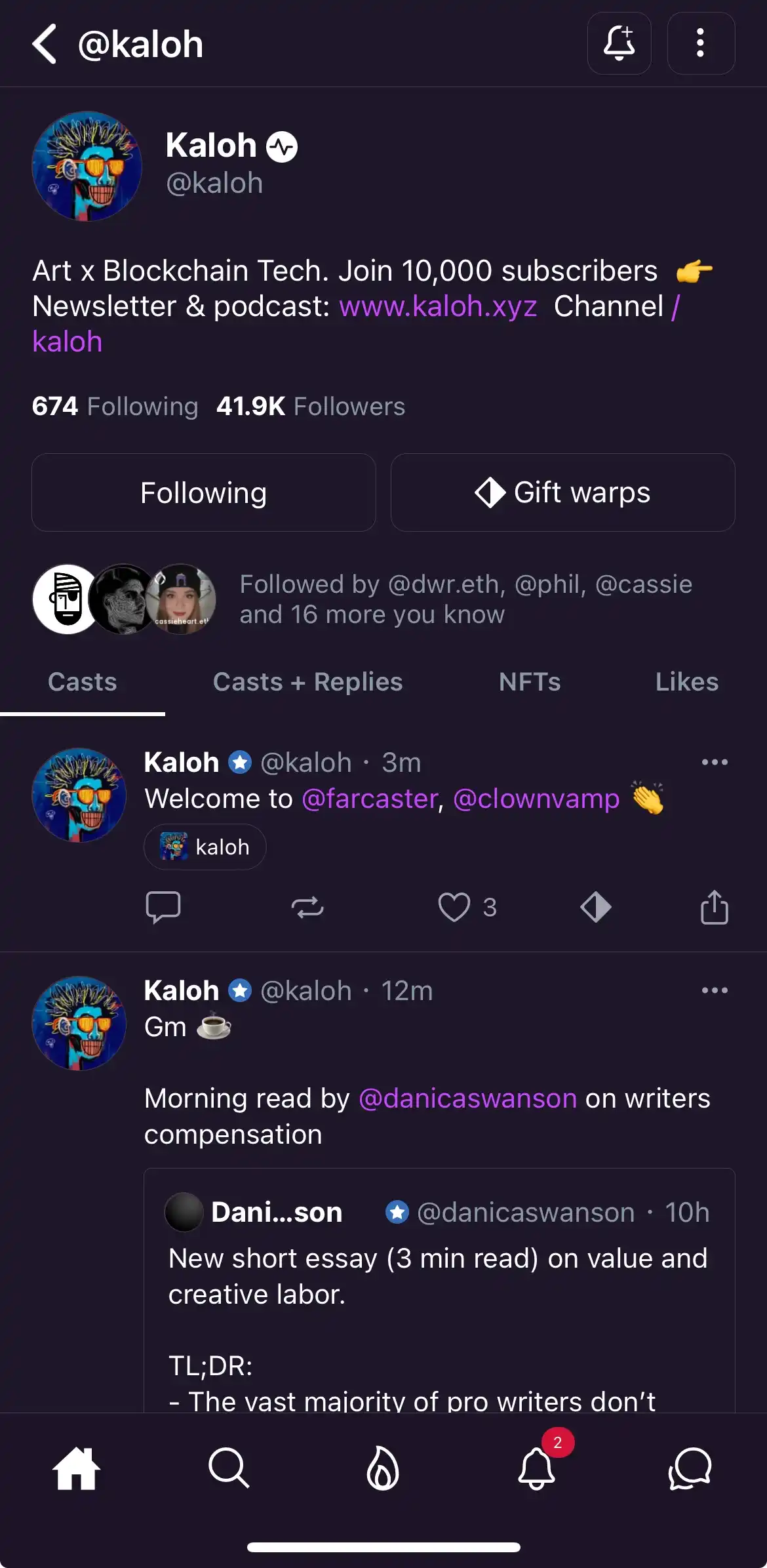 在这个 App 里面,社交媒体 KOL 的关注量和风格与「老平台」们完全不一样——V 神在这个 app 里面只拥有 9 万左右的关注者,而在主页内可以看到的一个账号,@kaloh,目前拥有 42400 个关注者(而他本人在推特上的账号在 2 万关注者左右)。同样的「权重重配」也发生在其他几个账号上,@hww,@df,@jacopo.eth,从 Trending 的 cast 界面随机点进去的账号基本上粉丝都会比推特的对应账号粉丝数量多很多,有些甚至是十倍以上。