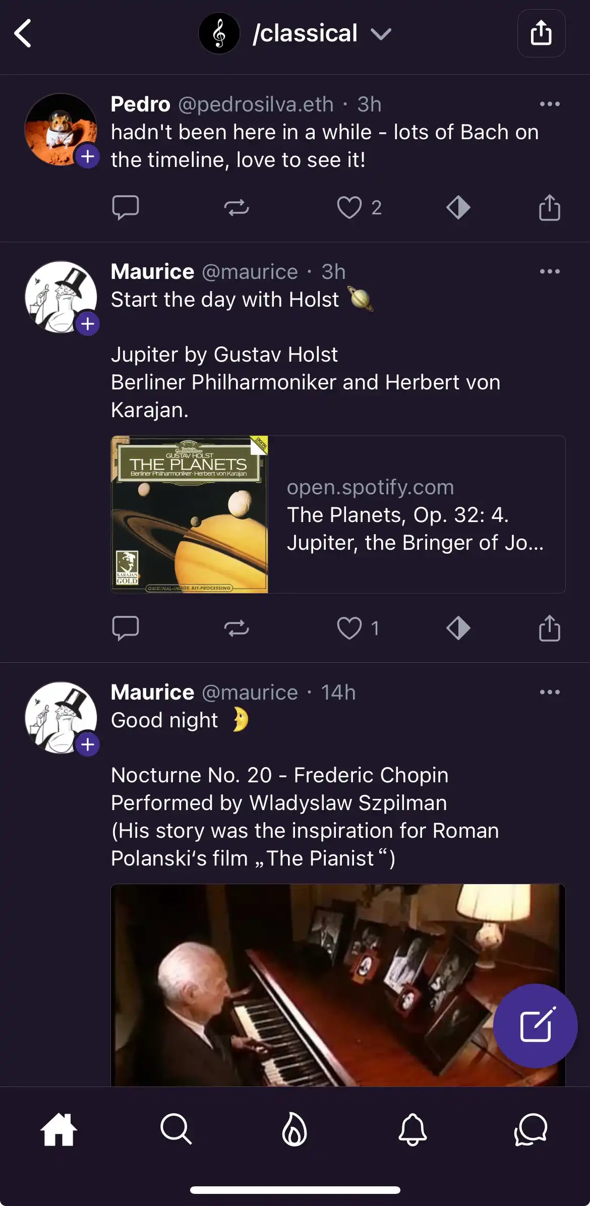 譬如在话题「古典音乐」标签下,发出的 cast 实际上数量比较少,仅有版主和几个活跃的人士在根据自身对于音乐的兴趣在分享一些音乐。而点进这些活跃人士的主页,会发现他们其实也是币圈生态中的一环,几乎所有人都带着「building xxx」(正在建设某某项目)的标签。可以看出,在这个时间点的使用者几乎是完全以币圈用户为主。
