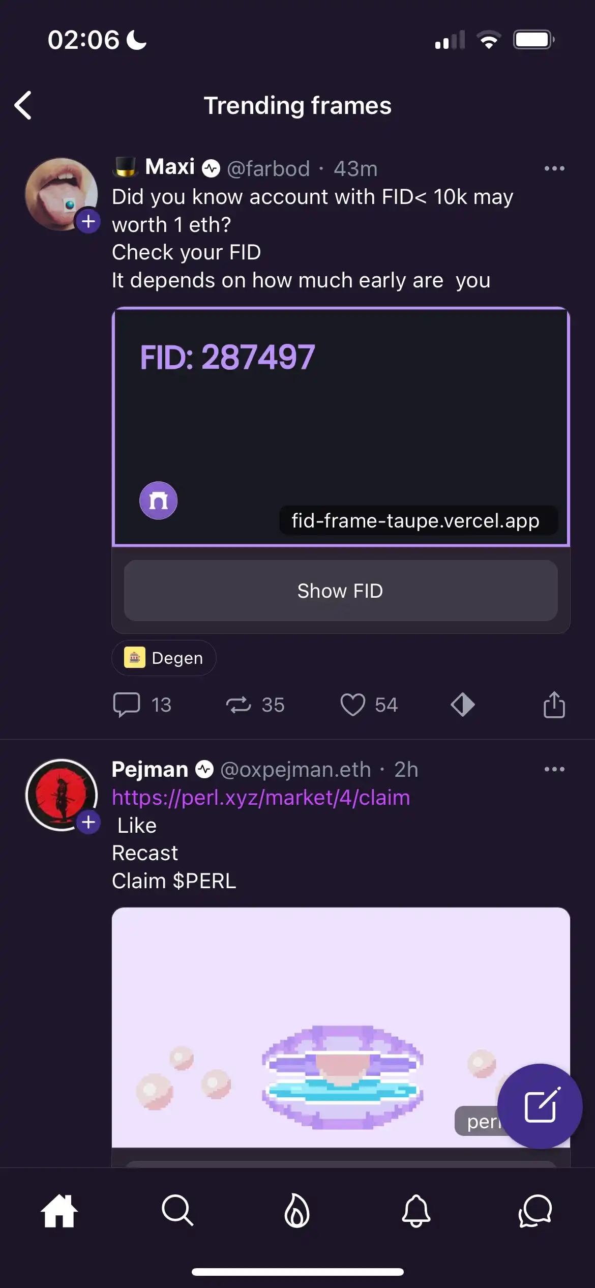 在这张图片里,用户可以一键点击图中的「Show FID」来检测自己的 FID。在这张图片里,内容创作者发布的文案是充满吸引力的:「你知道 FID<1 万的账户可能价值 1 个以太坊吗?检查一下你的 FID,这完全取决于你有多早(加入 Farcaster 生态)。」作为用户,理所当然会有点进去的理由;而这一点是传统的 Twitter 的平台很难做到的,因为 Twitter 缺少其他 App 原生植入的功能;而相对于传统的 Quest 而言,用户完全不需要点击那么多步来完成任务并获取奖励,一切都可以在 Warpcast 上完成,这无疑给用户提供了巨大的动力。