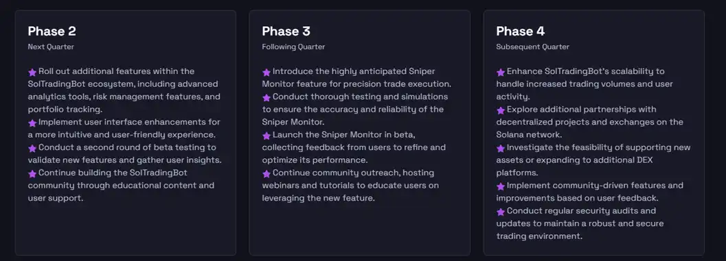 虽然目前 SolTradingBot 的功能尚未达到最完善的状态,项目方已经制定了明确的路线图,并计划在 2024 年的不同阶段完成。对于一个已在市场上占有一席之地的 Telegram Bot 项目来说,继续提升用户体验无疑有助于在未来抢占更大的市场份额。