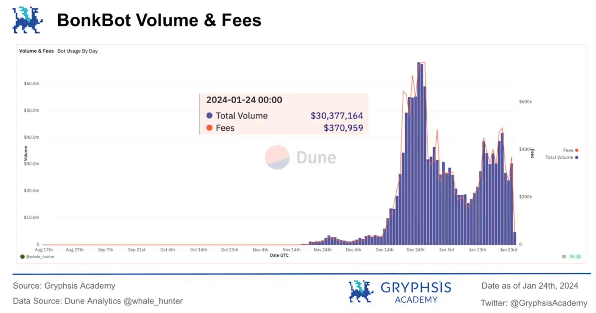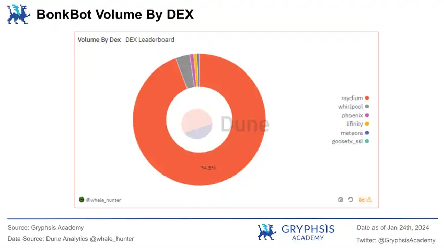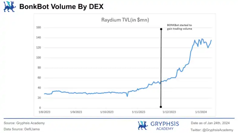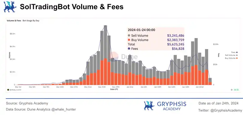 该项目作为后起之秀,在十二月才刚推出,但恰好赶上了炒卖 Solana 迷因币的高峰期。在不足一个月的时间里,到了 12 月 26 日,它的交易量已经超越了 UniBot 和 Banana Gun。