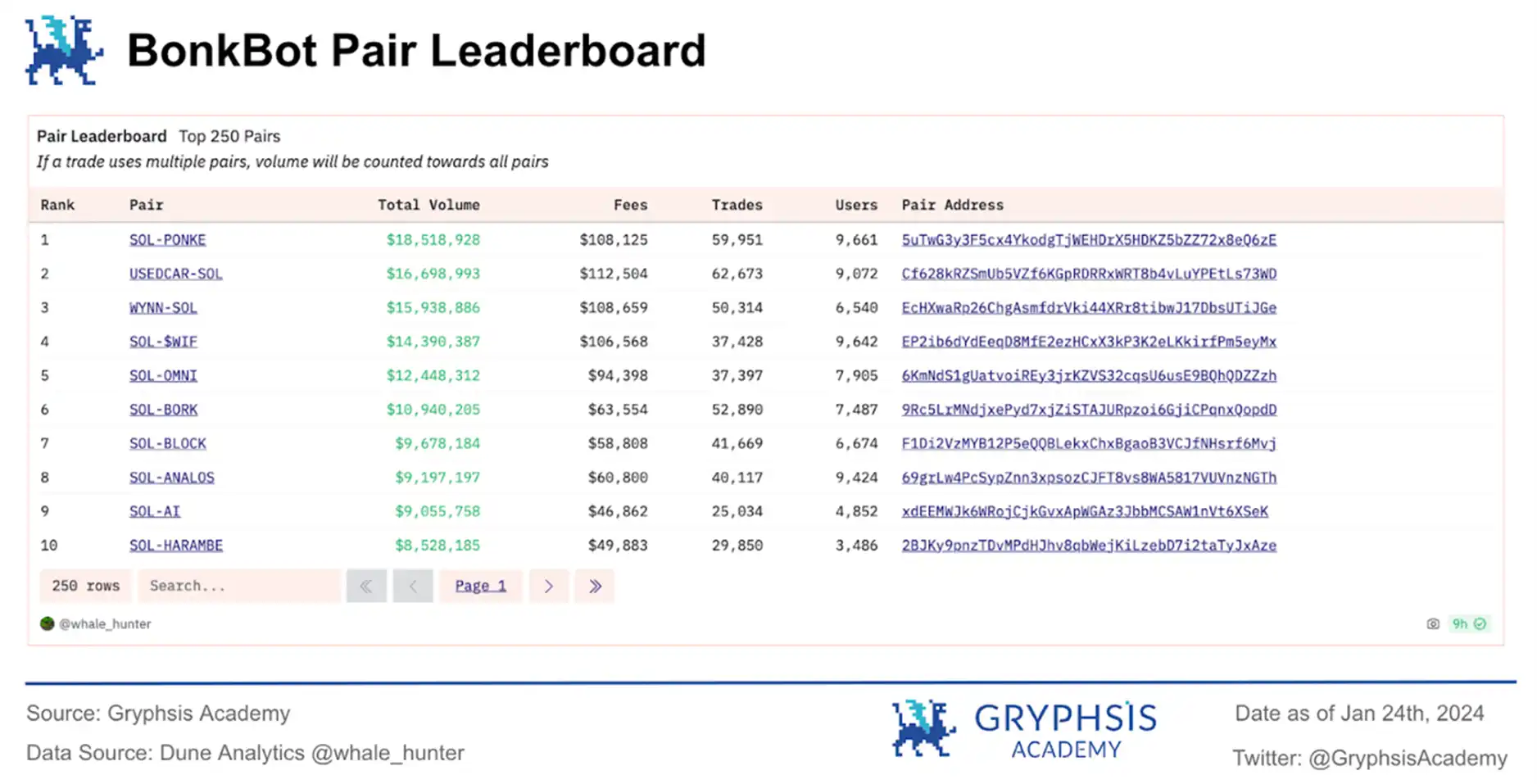 交易量最高的代币亦不乏一些有热度的迷因币,例如 SOL/SFAR,SOL/OMNI, SOL/BORK, SOL/PONKE 等。
