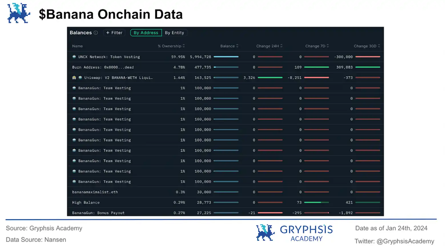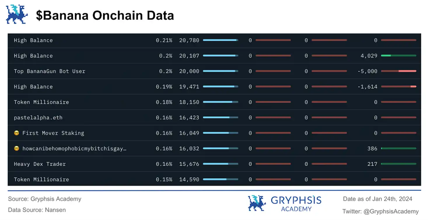 透过深入分析 $BANANA 的链上数据,我们可以详细了解代币的分布状况和流动性转移,这对于全面掌握代币的整体健康至关重要。