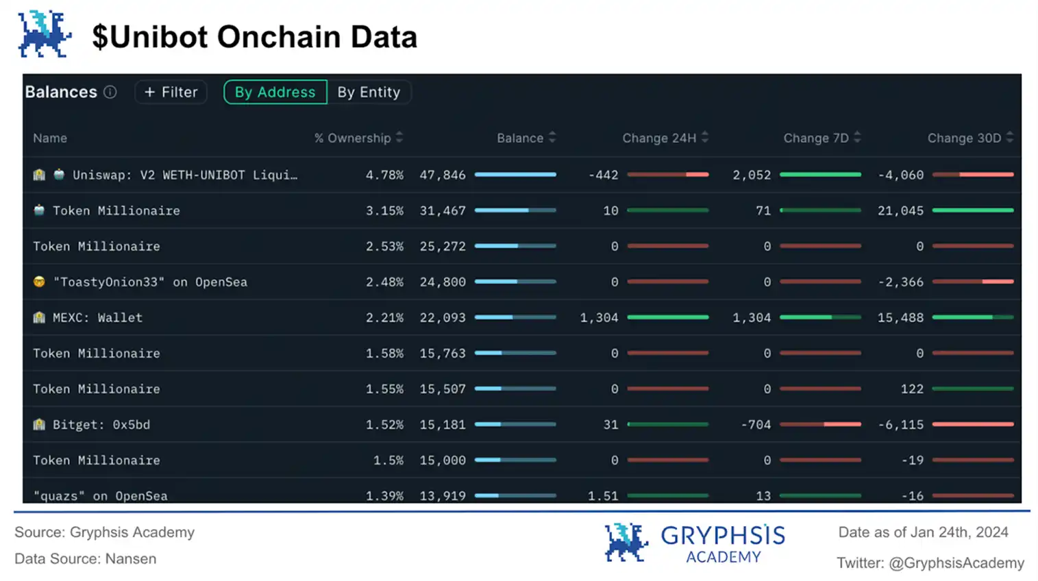 对比之下,$UNIBOT 的头十持有者持有较为多的比例,总共占接近 20%。