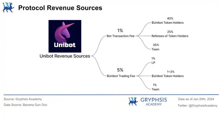 以 Banana Gun 为例,该项目已实现通过机器人服务产生的收入稳定并超越交易税,因而转向了 0% 代币税模式。长远来看,Unibot 面临的挑战是如何通过机器人手续费捕捉更多价值,毕竟这才是项目的核心业务。过分依赖代币交易税作为收入来源,不利于项目的长期可持续发展。