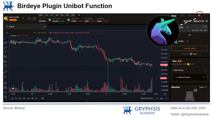 与交易数据聚合器平台 Birdeye 合作:能够无缝地支持所有在 Birdeye 上展示的项目交易,个人认为是提升用户体验的极致功能,也是 UniBot 未来在 Solana 市场取得成功的重要转机。
