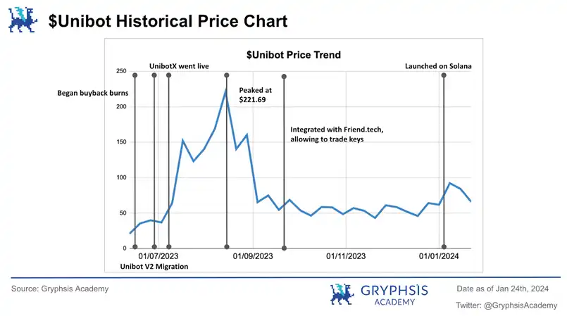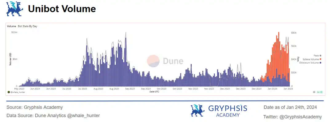 到了 2024 年一月,Unibot 顺应 Solana 迷因币的热潮,成功扩展至 Solana 平台,捕获了大量的交易量。