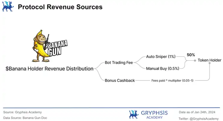 在这种情况下,Banana Gun 的年化总收入达到了 2,108 万美元,显示出其卓越的创收能力。特别值得一提的是,由于项目的机制为代币持有者提供了相对较高的收入比例,其代币持有者的年化总收益也达到了 922 万美元,这一数字在同类项目中如 Unibot 和 Sushiswap 中表现突出。