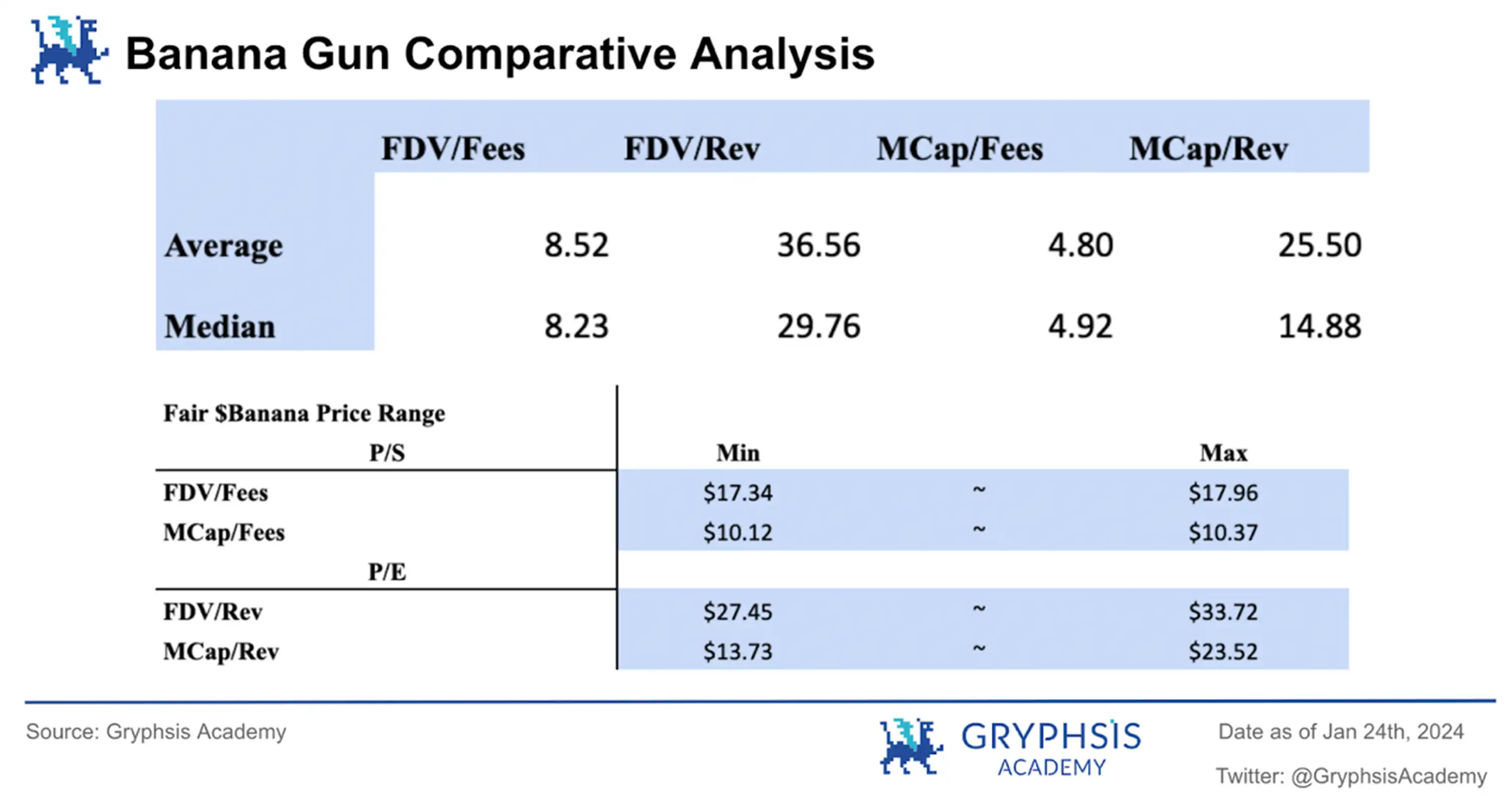 为了更准确地估算 $BANANA 的合理价格,我们采用了可比分析法,选择了与 $BANANA 规模和性质相似的区块链项目进行比较。关注的主要评估指标包括市销率(Price-to-Sales)和市盈率(Price-to-Earnings)。