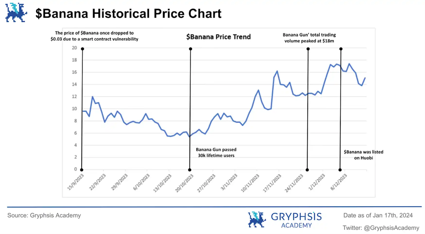 在空投发放数小时后,由于智能合约中存在漏洞,错误地允许用户出售他们的资产的同时,仍允许他们在钱包中保留税收代币。$BANANA 的价格严重下跌至 0.03 美元。