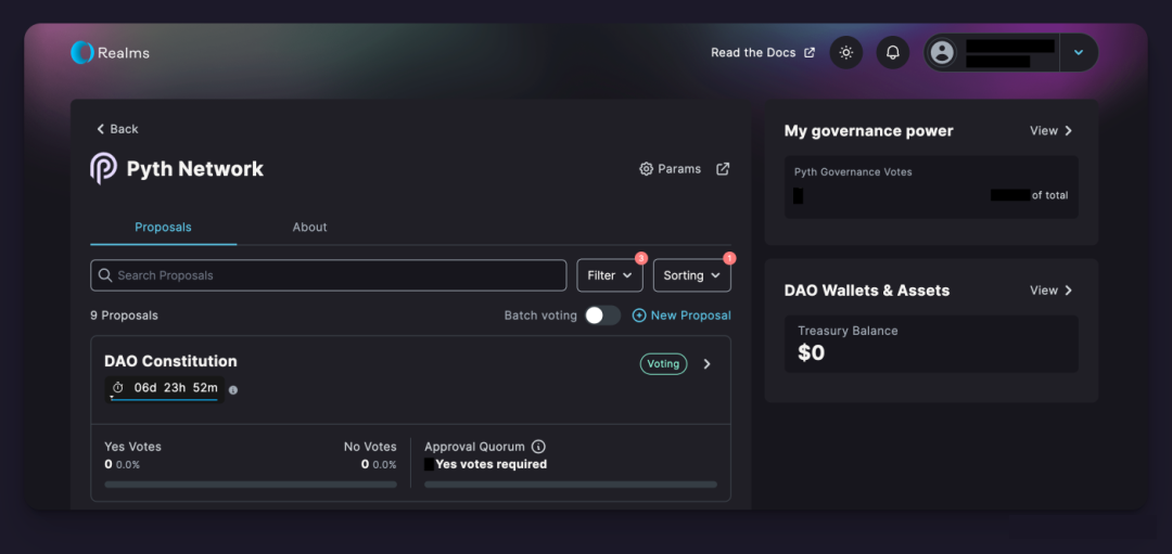 一旦提案进入「投票」阶段,PYTH 代币的质押者将能够参与其中。首先,请登陆 Pyth DAO Realms 页面。