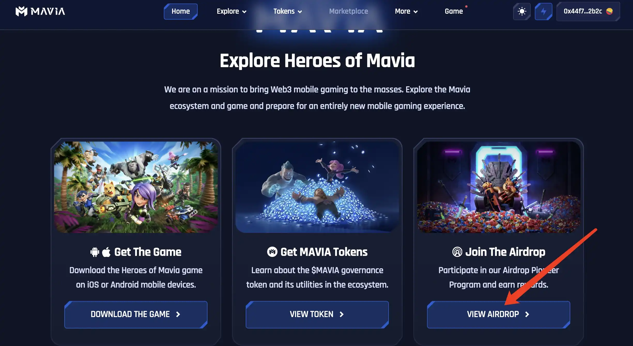 STEP 4. 转移到电脑端,登陆网站 http://Mavia.com后,翻动页面点击「VIEW AIRDROP」。