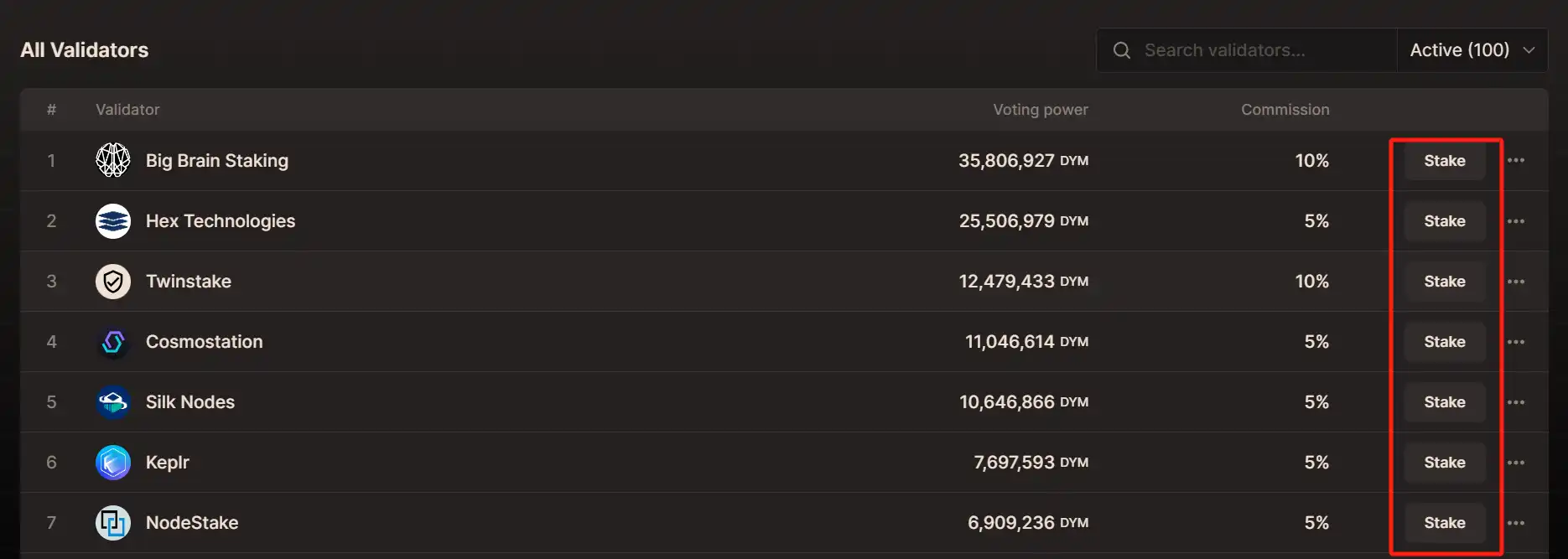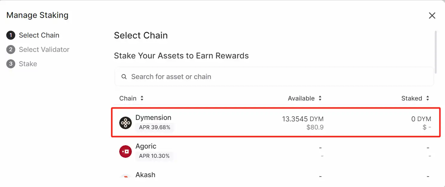 在弹出的页面选择 Dymension,然后选择所要加入的验证节点,点击 Stake。