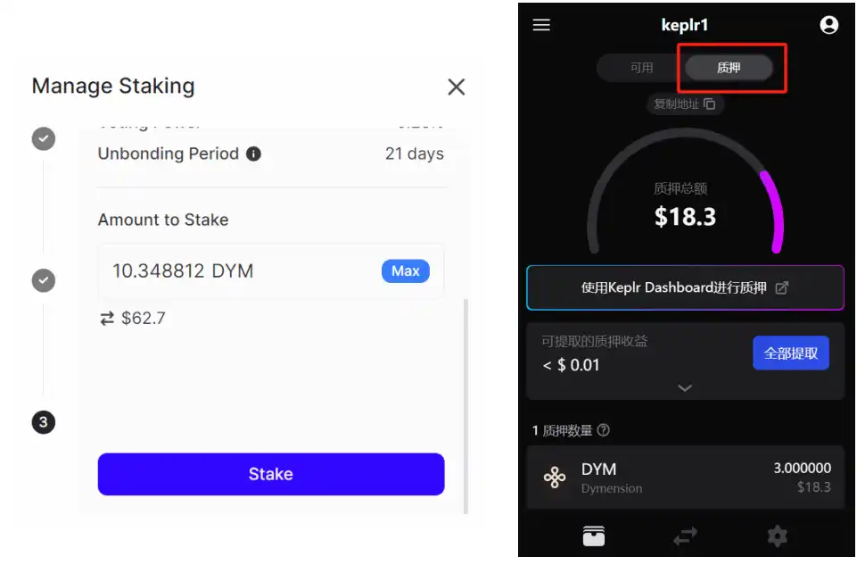 最后再次确认,输入所要质押的 DYM 数量(注意需要留一些 DYM 作为 gas 费),点击 Stake 完成质押。回到 Keplr 钱包的浏览器插件界面时,可以较为便捷清楚地了解自己的持有和质押情况。