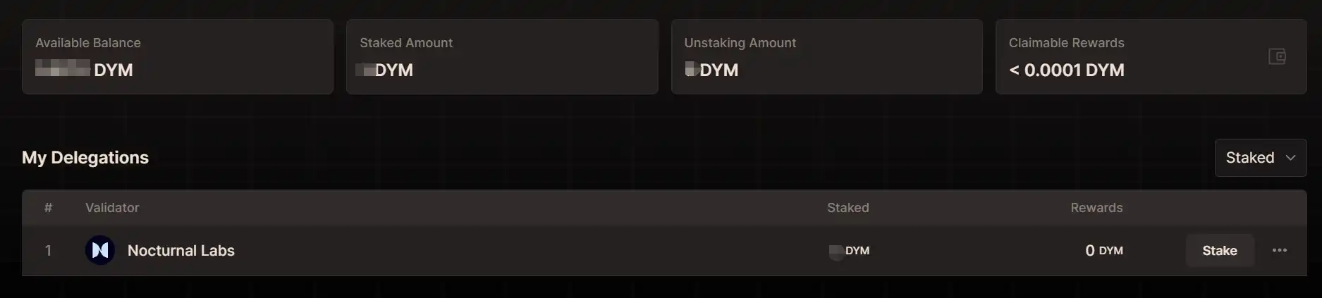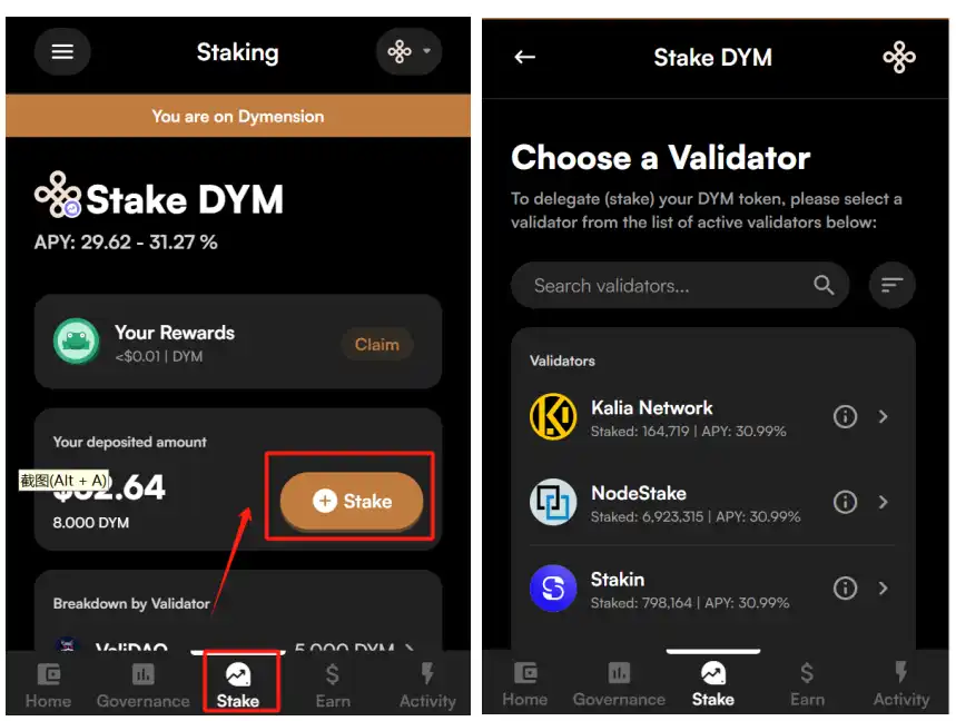 点击下方的 Stake 切换至质押界面,这个界面可以显示 DYM 的质押情况,点击+Stake 进行质押,在弹出的界面选择验证节点,确认后提交即可完成质押。