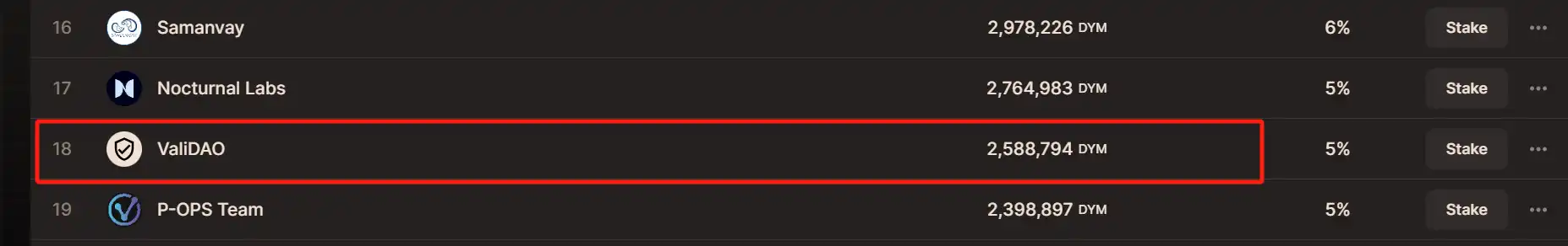截至撰稿时,ValiDAO 在 Dymension 的一百个验证节点中排名第 18 位,共质押了超 258 万枚 DYM。