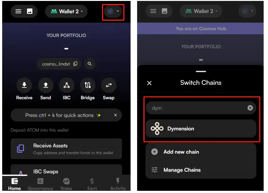 进入 Leap 钱包浏览器扩展界面,点击右上角切换网络至 DYmension 上。