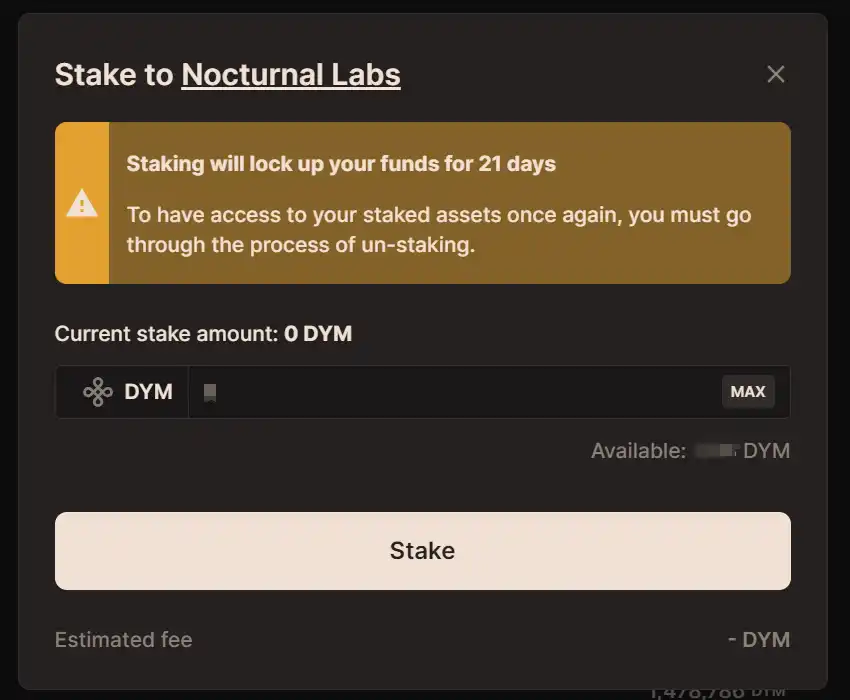 向下滑动界面,选择好验证节点后,点击 Stake 进入界面。由于验证节点的排名会发生变化,建议多参与几个节点的质押,并避开排名特别靠后的验证节点,以增加进入未来空投名单的概率。在弹出的界面中输入所要质押的 DYM 数量,再次点击 Stake 即可质押。