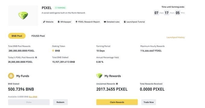 本次挖矿一共持续 10 天,可以使用 BNB、FDUSD 免费获得代币 Pixels(PIXEL),我从第一天开始就质押进去了,目前获得 2017 枚代币;