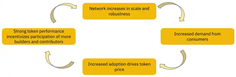 拥有自我强化的增长循环将有助于 DePIN 项目的可持续发展。代币奖励是克服供应方参与者采购的「冷启动」挑战的有用激励措施。随着网络规模的增加,随着消费者开始使用网络服务,需求应该会回升。鉴于服务支付通常以网络代币的形式进行,增加的采用应该转化为更高的代币价格,这将进一步激励贡献者。随着需求和供应的同步增长,这种良性循环可以持续下去,维持项目的持续增长。